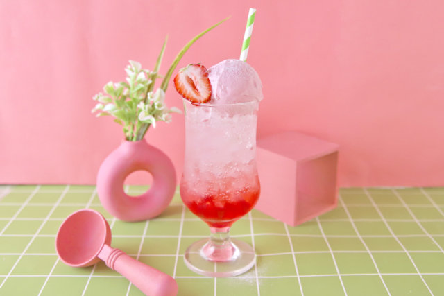 爽やかな風味のストロベリーソーダに、大きな濃厚いちごアイスがON。