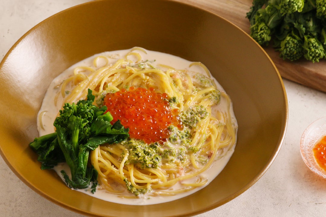 こななのおだしに明太子、豆乳を合わせた優しい味わいのクリームパスタ。