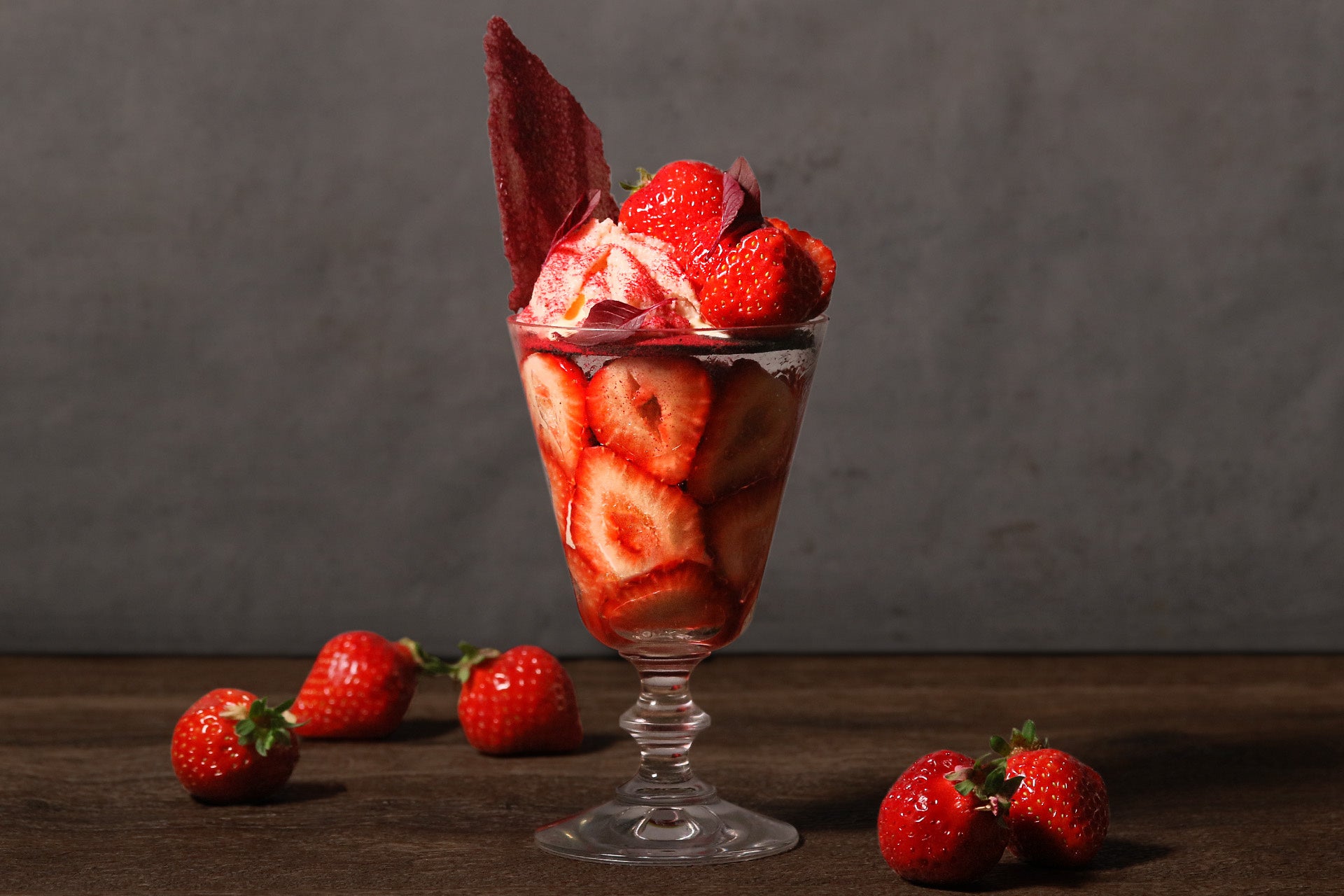 ジュレを纏わせ華やかな装いのあまおうを、グラスいっぱいに敷き詰めたパフェ。