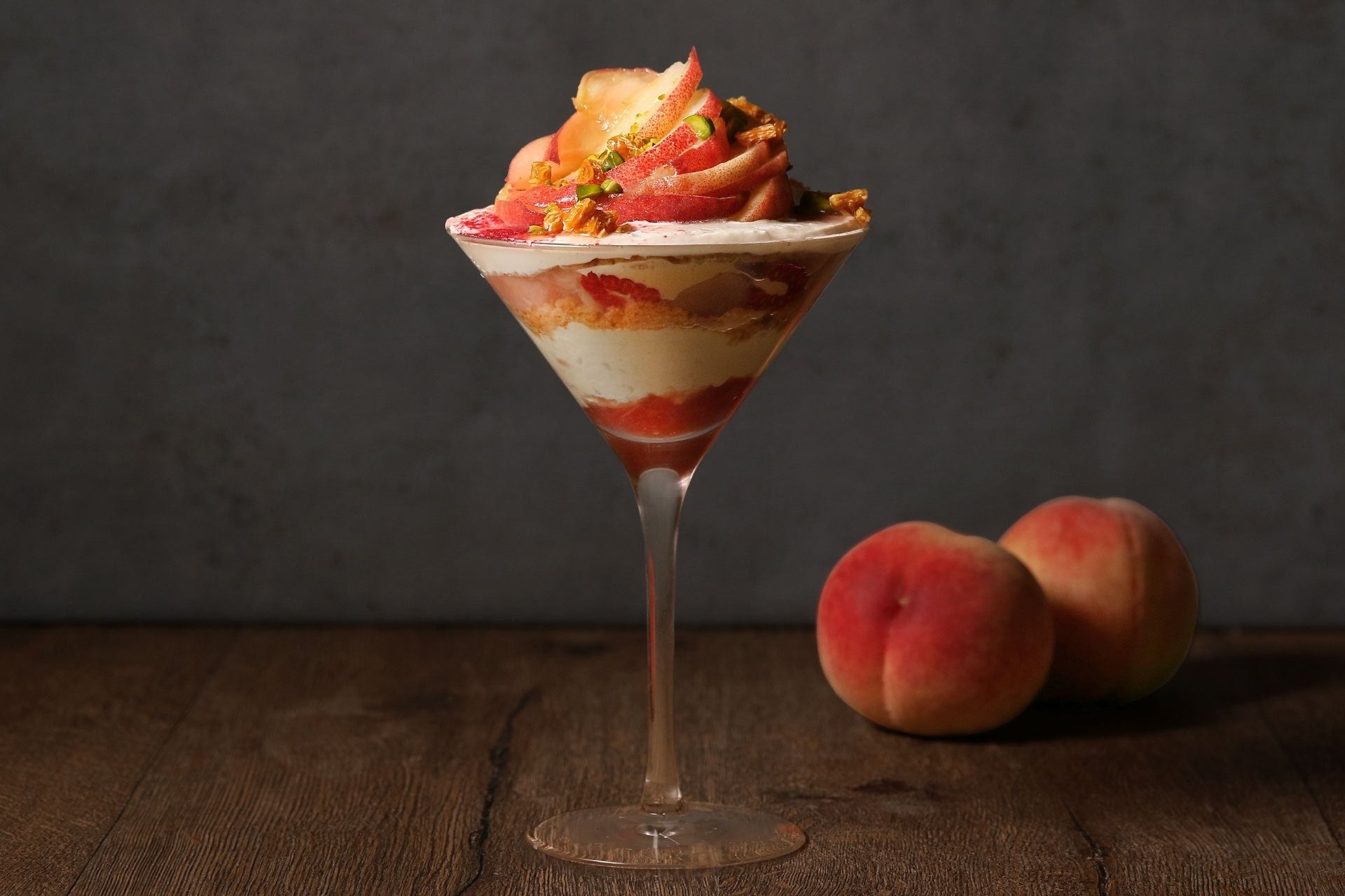 瑞々しい白桃のコンポートをたっぷりと使用した、桃色の淡いグラデーションが見るも美しいパフェ。