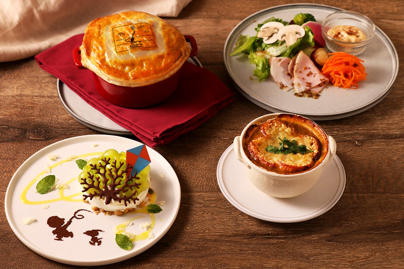 PEANUTS 75th アニバーサリースーベニア付きプラン(5 品) ROOM 代 + ¥8,800(税込) ピーナッツバターのフムスをディップして楽しめる季節野菜のグリルやキャロットラペなどの前菜、甘みの強い淡路玉ねぎを使用したグラタンスープや、赤ワインの効いた濃厚なデミグラスソースでじっくり煮込んだ牛ほほ肉のパイシチュー、コミックに登場する“凧食いの木”をモチーフにしたデザートをご堪能いただけます。