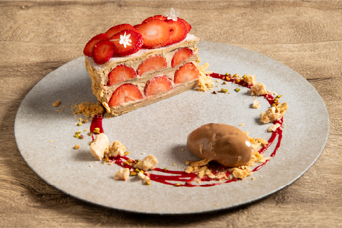 ミルクティー香るクリームを何層にも重ね、仕上げに苺を飾り、ミルクレープ仕立てに。香り豊かな紅茶アイスを添えて。数量限定のクレープです。