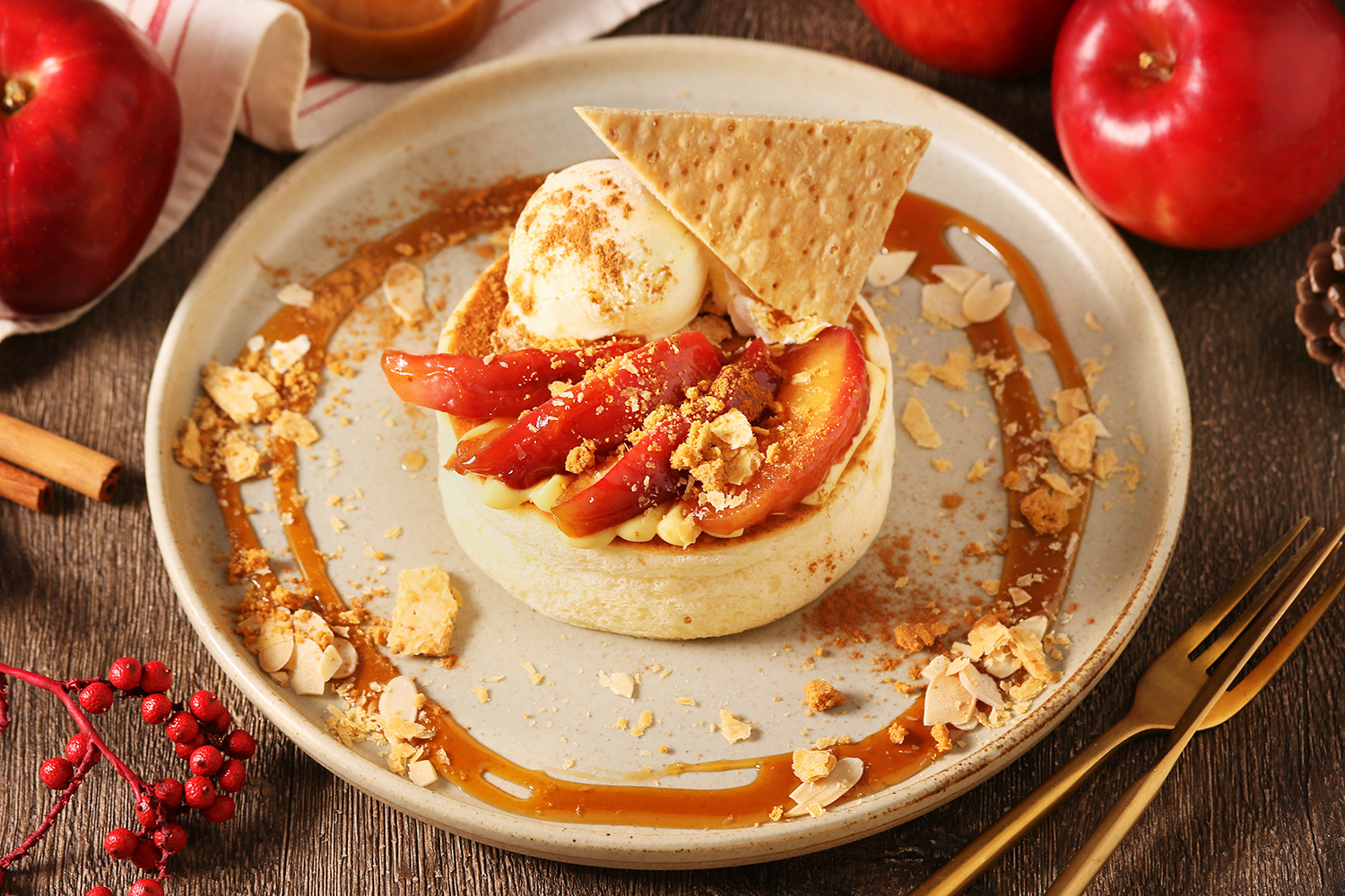 シナモンの香りとミルフィーユの食感が重なり、まるで焼きたてのアップルパイのようなご褒美パンケーキに仕上げました。