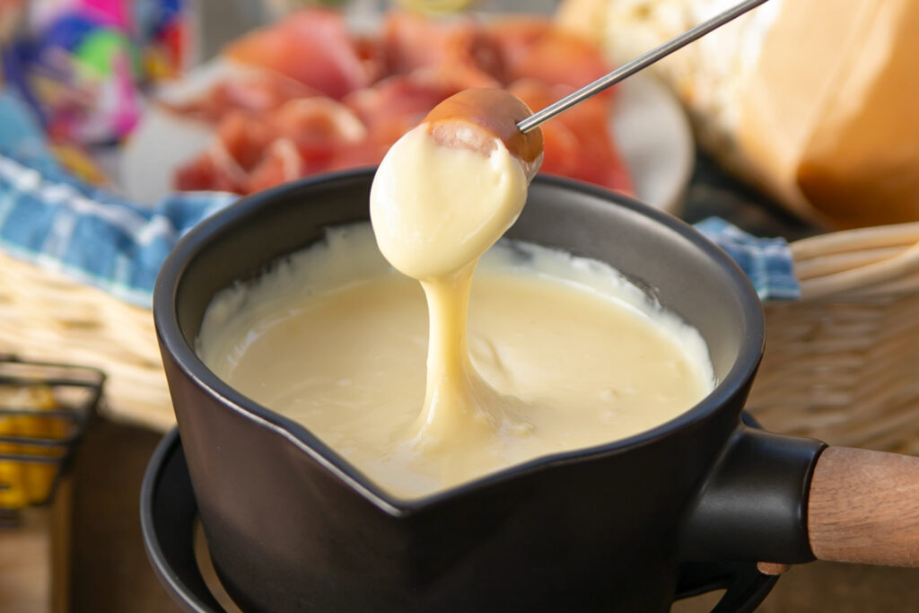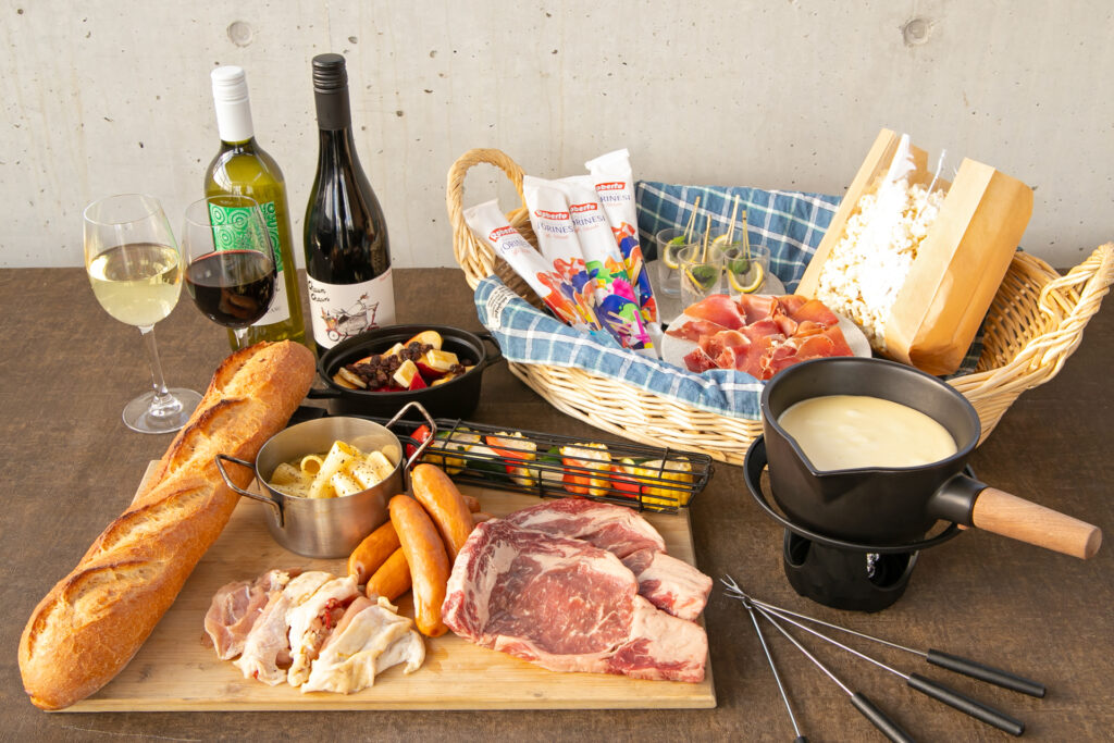 ・チーズフォンデュBBQ [バケット、じゃがいも、ブロッコリー、リブアイロール、ソーセージ、チキン]