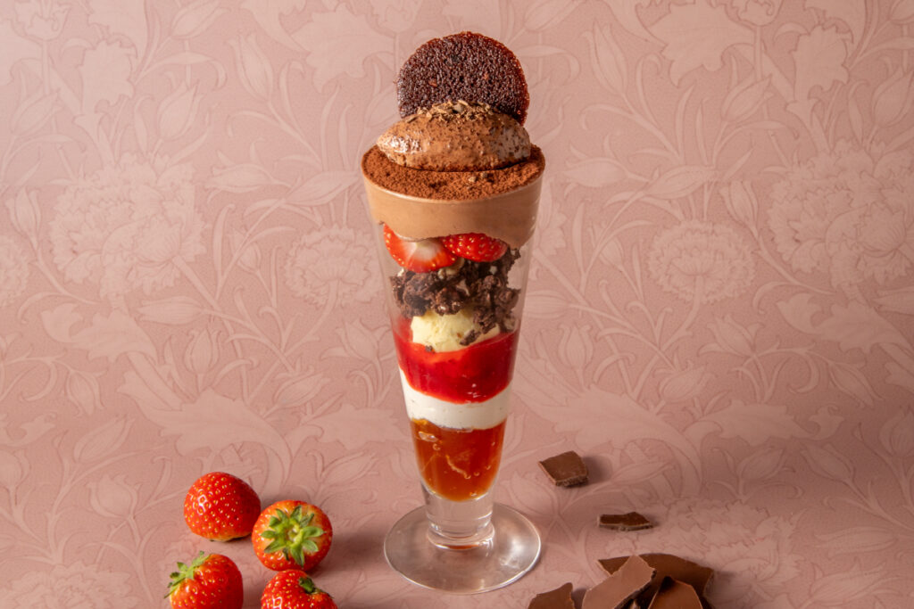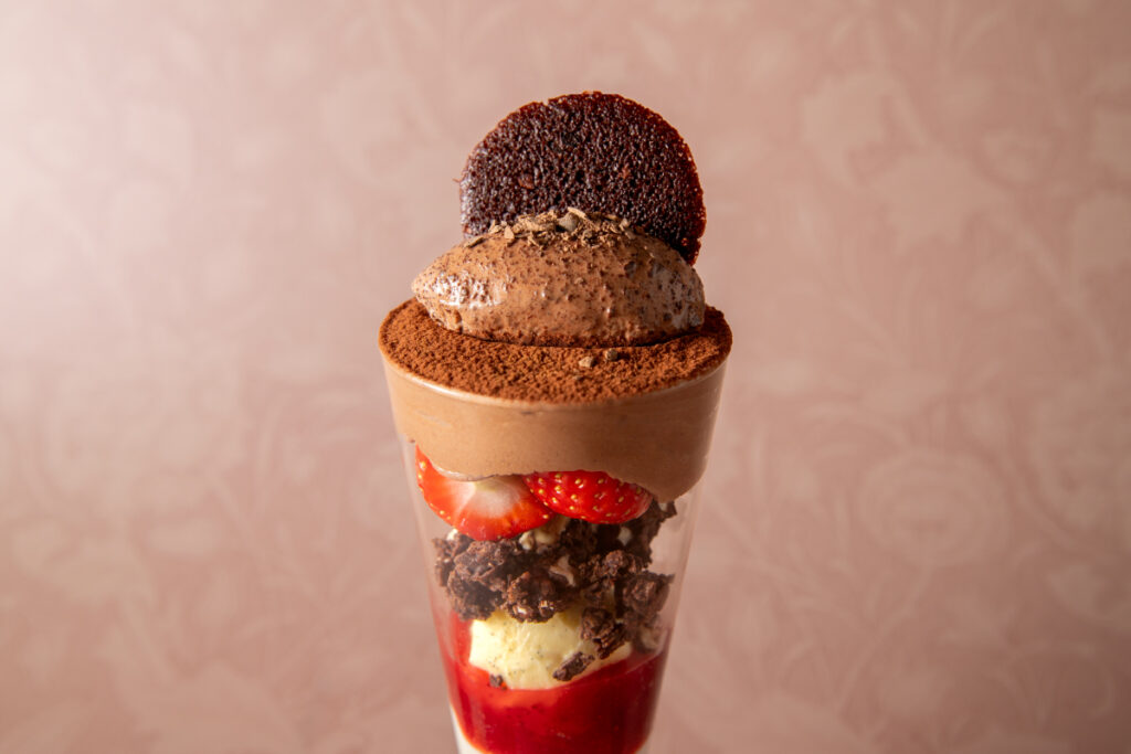 濃厚なショコラクリームに、苺の甘酸っぱさと、カカオとアッサム香る紅茶のジュレを重ねた、パティシエ特製の冬限定のパルフェ。