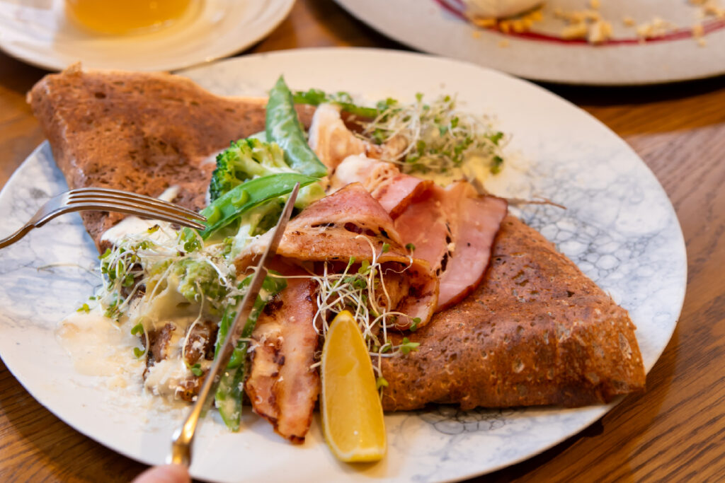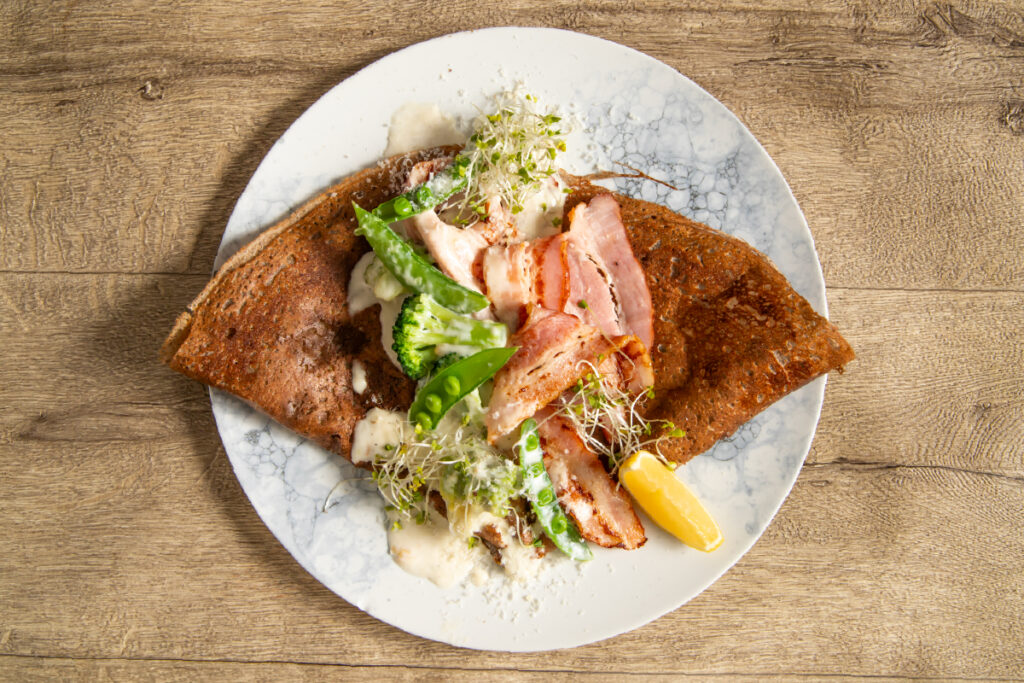 香ばしく焼いたグリルベーコンと春野菜をたっぷりのせたクリームガレット