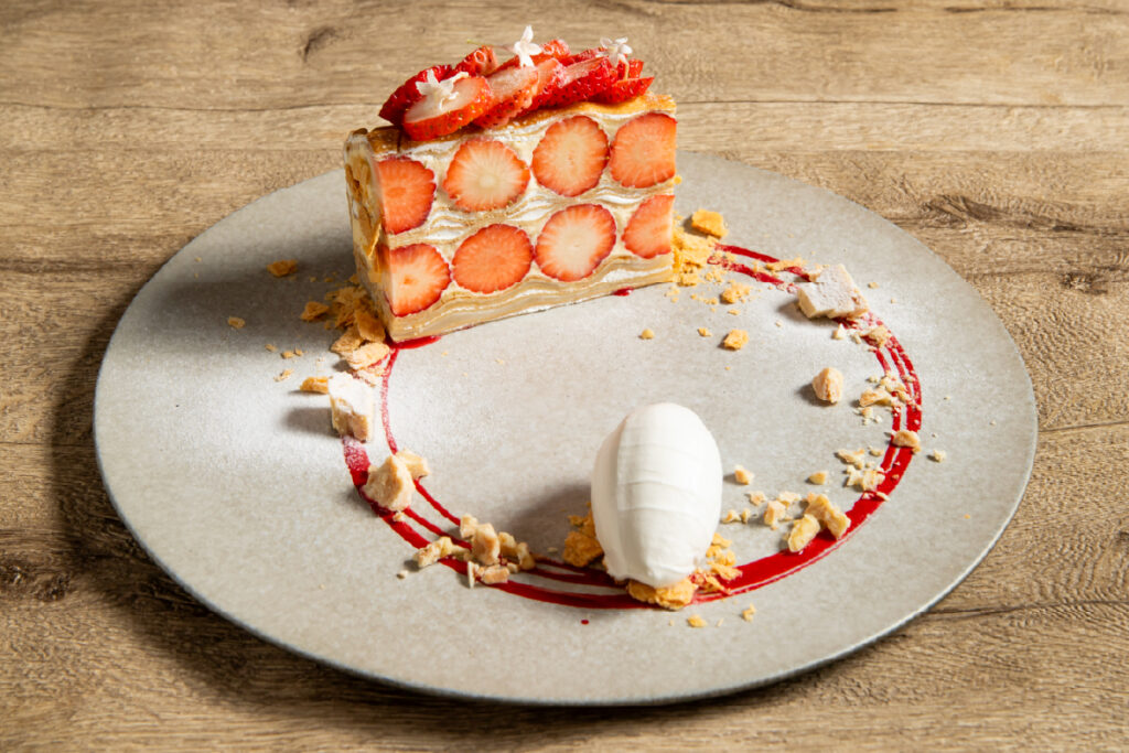◆春いちごとバニラカスタードのミルクレープ 白胡麻のクランチショコラとミルクアイス添え