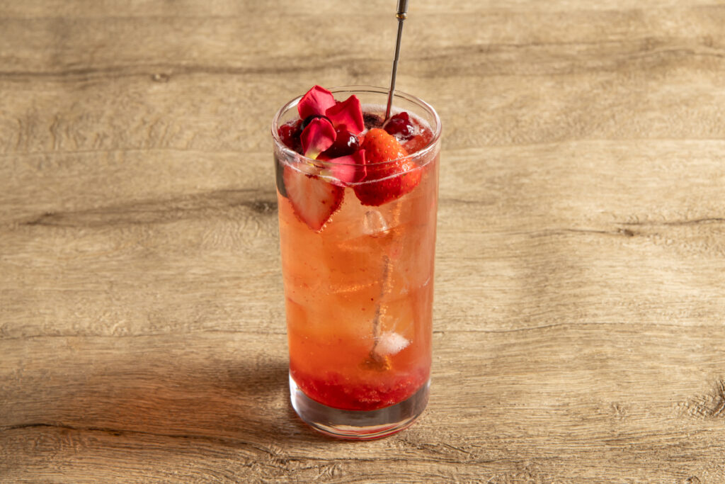 いちごとローズのコンフィチュールにセイロンベースのティーシロップを合わせたティーソーダ