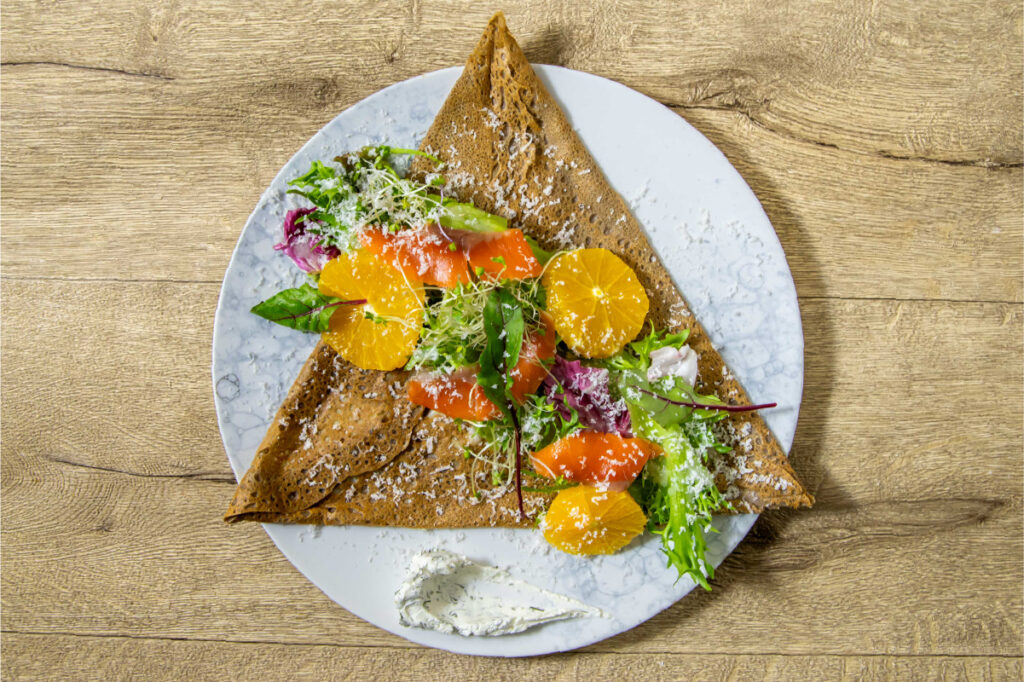 スモークサーモンの旨みとオレンジの酸味を、香り豊かなハーブクリームがやさしくまとめる彩り鮮やかなサラダガレット