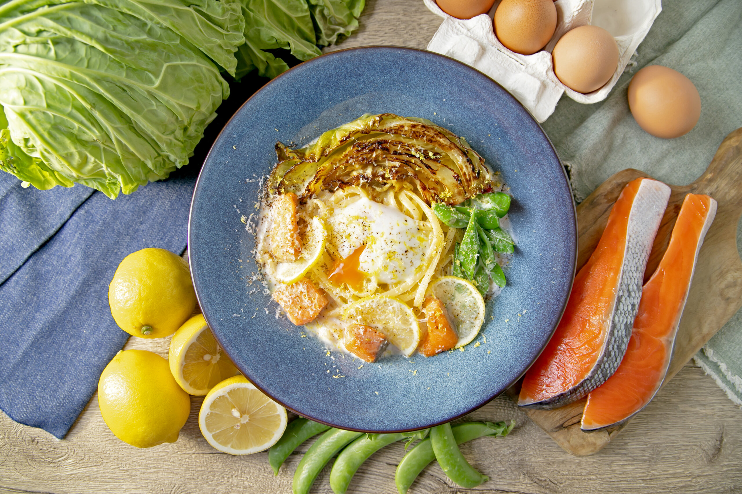 ▲半熟に仕上げた北坂たまごと鮭と島キャベツのレモンクリーム 税込1760円