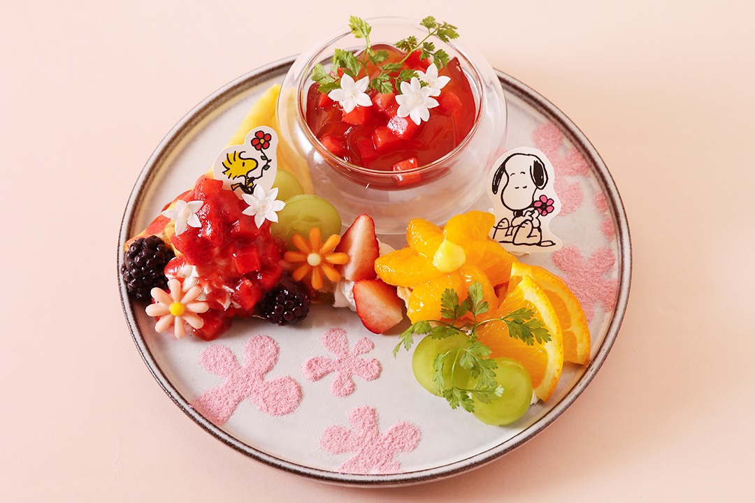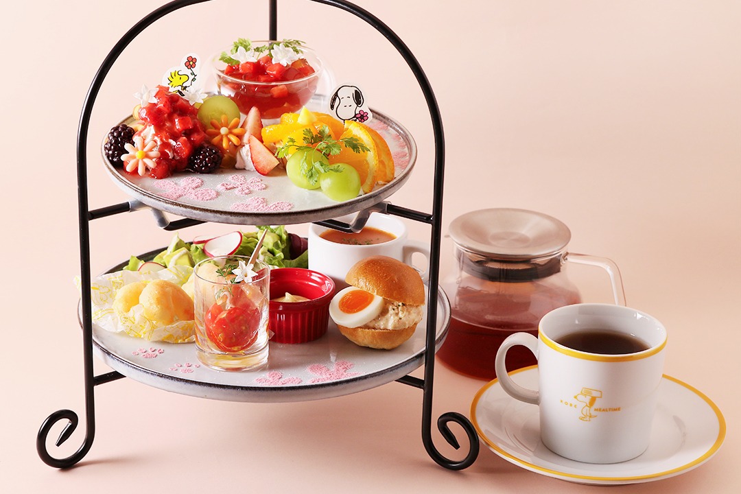 スヌーピー&ウッドストックのSPRINGアフタヌーンティー フリードリンク付 お一人様 ¥3,960(税込) いちごやお花をふんだんにあしらい、春らしい彩りを感じられるアフタヌーンティー。 ストロベリーティーのジュレやベリーとフロマージュのクレープ、オレンジのタルトレットなどの華やかなスイーツに加え、 プチトマトのマリネ 生ハム添えやシュリンプフリット、ツナエッグのスライダーなどのセイボリーをご堪能いただけます。 ※別途、1,650(税込)でパンケーキ(全4種)追加可能。